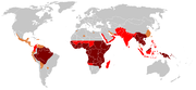 Après avoir sévi dans la presque totalité du monde habité, le paludisme touche 90 pays[43], principalement les plus pauvres d'Afrique, d'Asie et d'Amérique latine. Dans les années 1950, le paludisme avait été éradiqué de l'essentiel de l'Europe et d'une grande partie de l'Amérique centrale et du sud par des pulvérisations de DDT et l'assèchement des marais.